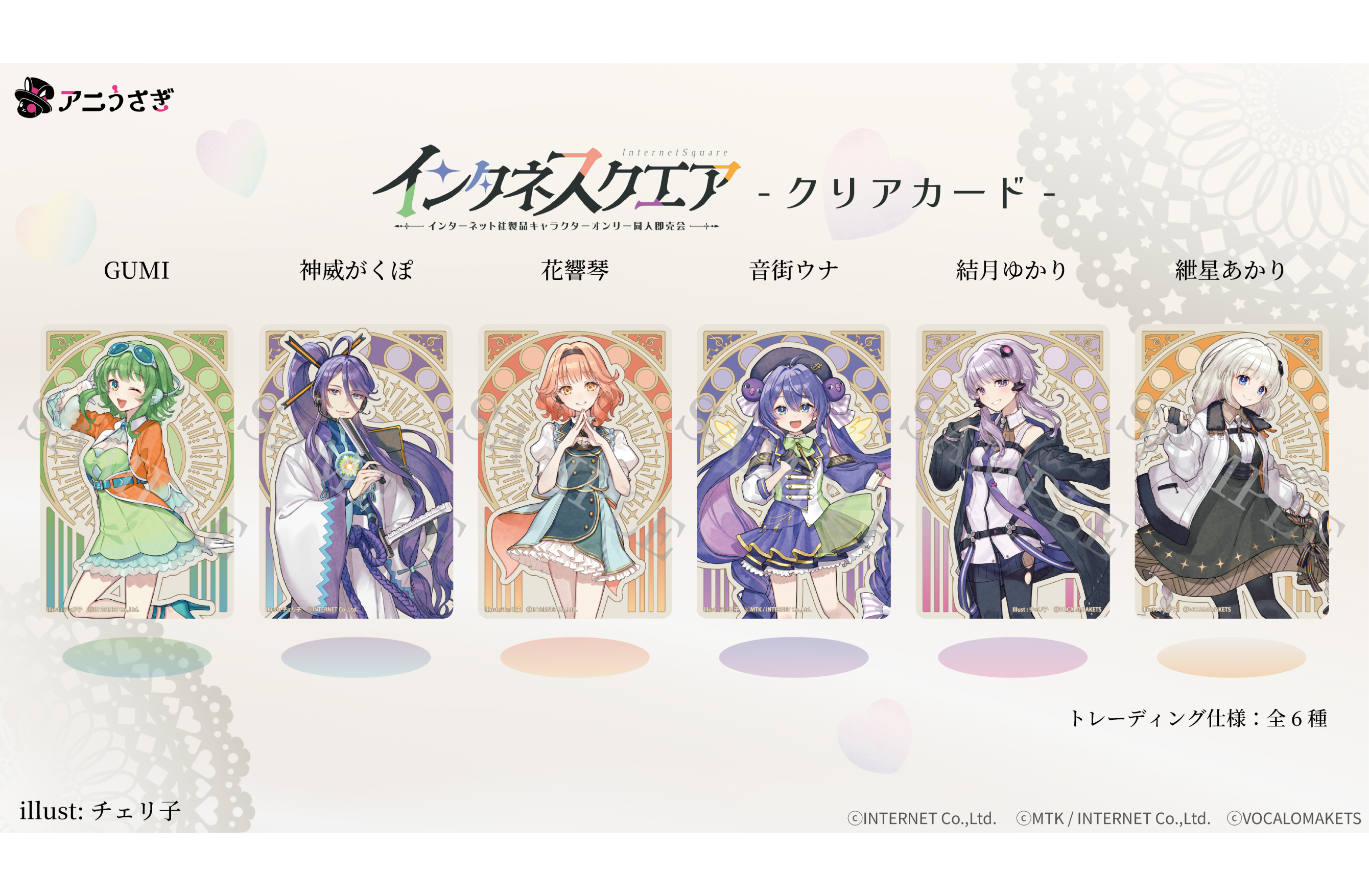 2026年1月10日(土)川崎市産業振興会館にて開催されるインターネット社製品のオンリーイベント『インタネスクエア』の開催を記念して、GUMI、神威がくぽ、花響琴、音街ウナ、結月ゆかり、紲星あかりのコラボグッズが発売決定! 『お菓子パーティー』をテーマにした新規ミニキャライラストが登場します。 イラストはこんくてん。さんによる新規描き下ろしです! イラストレーター、チェリ子さんによる『インタネスクエア』描き下ろしのメインビジュアルをお借りして制作したクリアカードも新発売! また、インタネスクエアお品書きグッズをお買い上げのお客様には特典もご用意しております。 【インタネスクエア】日時:2026年1月10日(土)会場:川崎市産業振興会館 企業05 アニうさぎブース アニうさぎオンラインストアにてグッズ通販も予定しておりますので、詳細はお知らせをお待ちください。