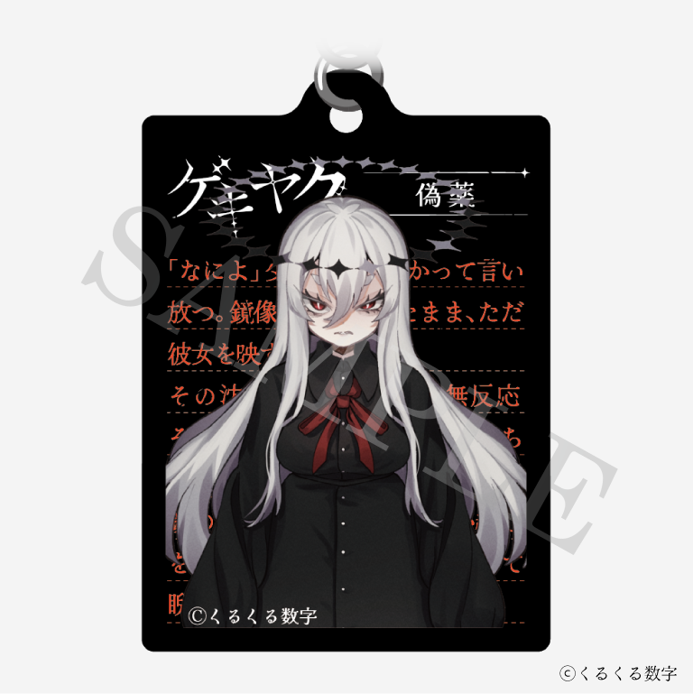 前面に【ゲキヤク 偽薬】のイラストがプリントされた透明アクリル、背面にキャラクターエピソードを日記調に記した黒アクリルを使用した2層で楽しめるアクリルキーホルダーです。
